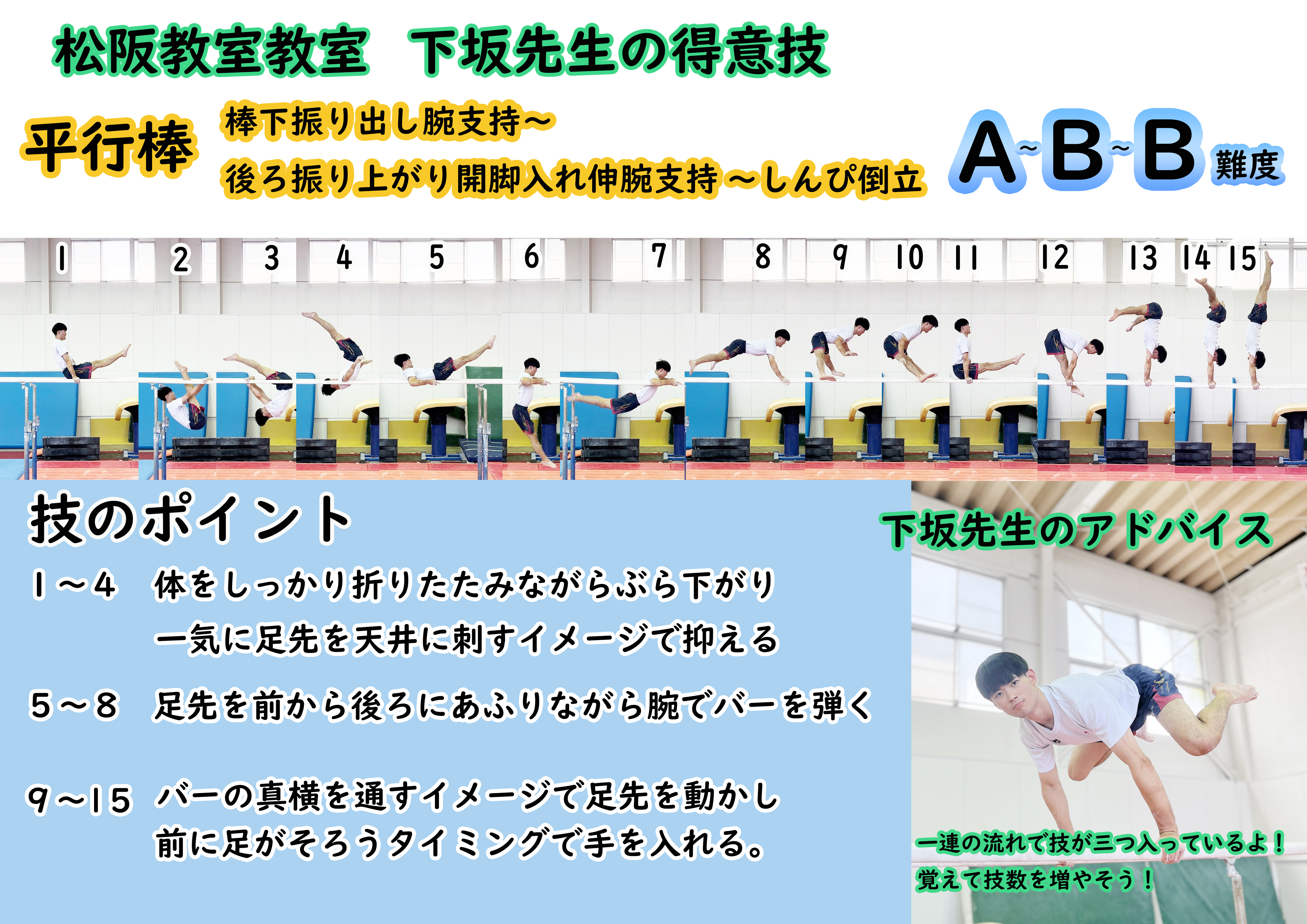 棒下振出し腕支持~後ろ振り上がり開脚入れ伸腕支持~しんぴ倒立平行棒・技名一覧スイング棒上宙返り倒立バブサー車輪ディアミドフ車輪宙返り下り車輪前宙開脚腕支持アームスイング棒下宙返りひねり倒立モリスエハラダ屈身ダブル横向き逆上がり1/4ひねり倒立宙返り下りツイストシャルロヒーリー棒下倒立ライヘルト前方2回宙返り下りアームツイストピンココロレフツイスト【比較】前振り1/4ひねり単棒倒立前方2回宙返りひねり下りマク―ツヒーリー【比較】ディアミドフ【比較】後方屈身2回宙返り下り【比較】前振り【比較】シャルロ~単棒ヒーリーバブサー後ろ振り上がり前方屈身宙返り支持バウマンギャッツン棒下宙返りひねり倒立【比較】棒下振出し腕支持~後ろ振り上がり開脚入れ伸腕支持~しんぴ倒立ベーレベーレ車輪ディアミドフティッペルト種目一覧