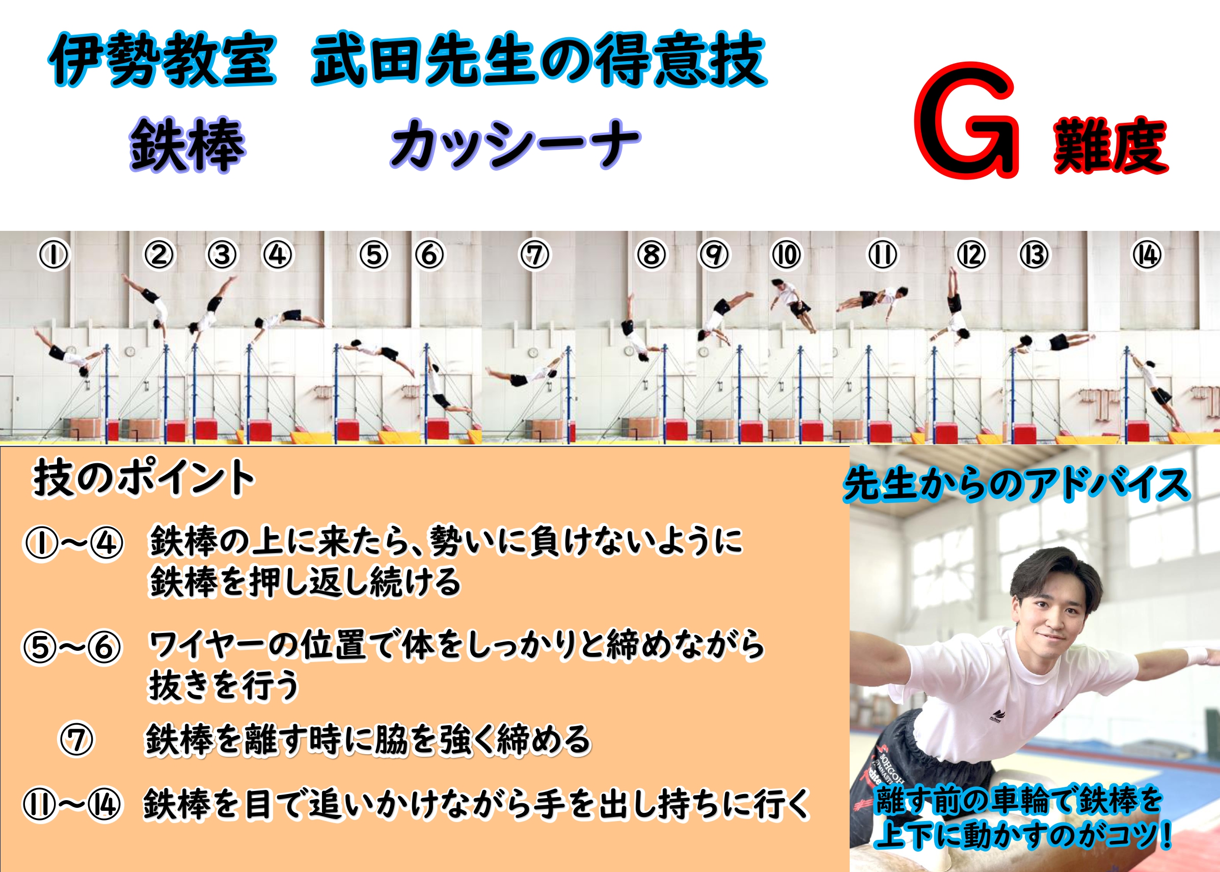 カッシーナ鉄棒・技名一覧け上がり支持スイング~後ろ回り&ともえ順手車輪スイング抱え込み宙返り下り背面イエーガーカッシーナ伸身ピアッティヤマワキモズニクシュタルダーコバチアドラーひねり倒立ツイスト~移行コールマン逆上がり&両足逆上がり伸身ムーンサルトエンドーアドラーひねり倒立~伸身トカチェフホップターンアドラー~背面車輪シュタルダーホップターンコスミックハーフ屈身コバチシュタルダーリバルコリバルコシュタルダー【比較】ホップターンハーフヤマワキ【比較】シュタルダーひねり大逆手ツォリミンアドラーひねり倒立【比較】ワイラー伸身ムーンサルト【比較】伸身コバチアドラー1回ひねり両逆手倒立チェコ式車輪閉脚シュタルダー伸身2回宙返り2回ひねり下り屈身トカチェフ伸身2回宙返り下り伸身トカチェフ後方片手車輪とびツイストとびツイストアンドリアノフリューキンカッシーナ種目一覧