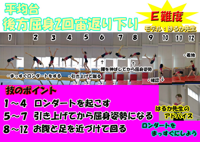 後方屈身2回宙返り下り平均台・技名一覧前方ブリッジシソンヌジャンプ側方開脚宙返り(横向き)伸身宙返り下り交差ジャンプ後方屈身2回宙返り下りオノディそり宙ロンダート、後ろとび1/2ひねり前方かかえ込み宙返り側転イリュージョン開脚後転とび後方2回半ひねり下りチックタックカデット台の端へ、ロンダート、後方宙返り着台水平ターン後方伸身宙返り2回半ひねり開脚後転跳び~開脚伸身宙返り種目一覧