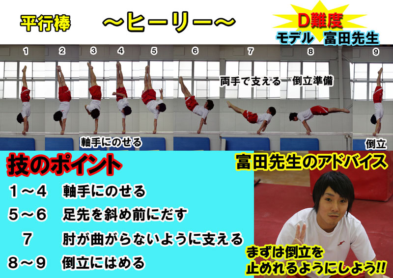 ヒーリー平行棒・技名一覧スイング棒上宙返り倒立バブサー車輪ディアミドフ車輪宙返り下り車輪前宙開脚腕支持アームスイング棒下宙返りひねり倒立モリスエハラダ屈身ダブル横向き逆上がり1/4ひねり倒立宙返り下りツイストシャルロヒーリー棒下倒立ライヘルト前方2回宙返り下りアームツイストピンココロレフツイスト【比較】前振り1/4ひねり単棒倒立前方2回宙返りひねり下りマク―ツヒーリー【比較】ディアミドフ【比較】後方屈身2回宙返り下り【比較】前振り【比較】シャルロ~単棒ヒーリーバブサー後ろ振り上がり前方屈身宙返り支持バウマンギャッツン棒下宙返りひねり倒立【比較】棒下振出し腕支持~後ろ振り上がり開脚入れ伸腕支持~しんぴ倒立ベーレベーレ車輪ディアミドフティッペルト種目一覧