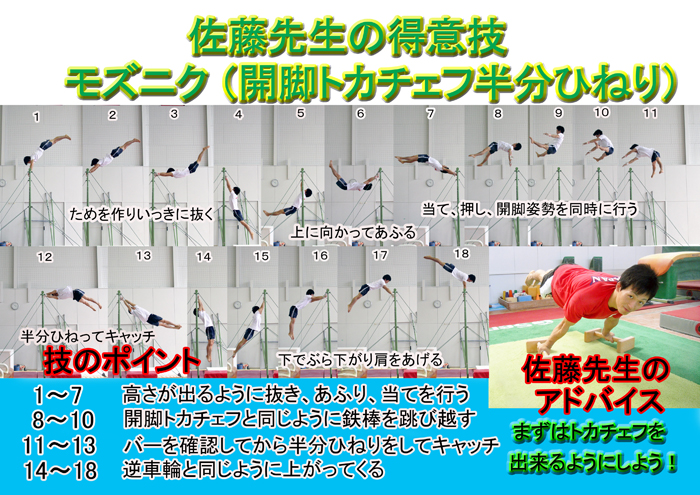モズニク鉄棒・技名一覧け上がり支持スイング~後ろ回り&ともえ順手車輪スイング抱え込み宙返り下り背面イエーガーカッシーナ伸身ピアッティヤマワキモズニクシュタルダーコバチアドラーひねり倒立ツイスト~移行コールマン逆上がり&両足逆上がり伸身ムーンサルトエンドーアドラーひねり倒立~伸身トカチェフホップターンアドラー~背面車輪シュタルダーホップターンコスミックハーフ屈身コバチシュタルダーリバルコリバルコシュタルダー【比較】ホップターンハーフヤマワキ【比較】シュタルダーひねり大逆手ツォリミンアドラーひねり倒立【比較】ワイラー伸身ムーンサルト【比較】伸身コバチアドラー1回ひねり両逆手倒立チェコ式車輪閉脚シュタルダー伸身2回宙返り2回ひねり下り屈身トカチェフ伸身2回宙返り下り伸身トカチェフ後方片手車輪とびツイストとびツイストアンドリアノフリューキンカッシーナ種目一覧