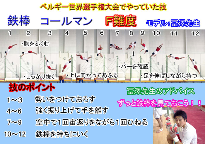 コールマン鉄棒・技名一覧け上がり支持スイング~後ろ回り&ともえ順手車輪スイング抱え込み宙返り下り背面イエーガーカッシーナ伸身ピアッティヤマワキモズニクシュタルダーコバチアドラーひねり倒立ツイスト~移行コールマン逆上がり&両足逆上がり伸身ムーンサルトエンドーアドラーひねり倒立~伸身トカチェフホップターンアドラー~背面車輪シュタルダーホップターンコスミックハーフ屈身コバチシュタルダーリバルコリバルコシュタルダー【比較】ホップターンハーフヤマワキ【比較】シュタルダーひねり大逆手ツォリミンアドラーひねり倒立【比較】ワイラー伸身ムーンサルト【比較】伸身コバチアドラー1回ひねり両逆手倒立チェコ式車輪閉脚シュタルダー伸身2回宙返り2回ひねり下り屈身トカチェフ伸身2回宙返り下り伸身トカチェフ後方片手車輪とびツイストとびツイストアンドリアノフリューキンカッシーナ種目一覧